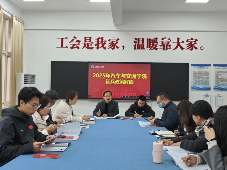 为扎实推进2025年度大学生征兵工作,拓宽学生参军入伍通道,凝聚征兵宣传工作合力,12月10日,汽车与交通学院组织召开征兵入伍政策专题宣讲会。学校武装部主任刘明库应邀作政策宣讲,学院团总支书记毛晓羽主持会议,全体辅导员参会。