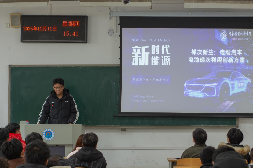 比赛现场,各参赛团队依次登台展示创新项目,项目亮点纷呈、干货满满。“智能出行管家APP”聚焦用户出行全场景需求、“智能充电桩优化方案”通过整合车辆保有量、交通流量、电网容量等数据实现精准选址与动态调整,“电动汽车电池梯次利用闭环运营”项目则紧扣新能源产业发展趋势,构建可持续的资源利用模式。这些项目既深度契合专业前沿方向,又兼具创新性与可行性,赢得了现场师生的热烈掌声。