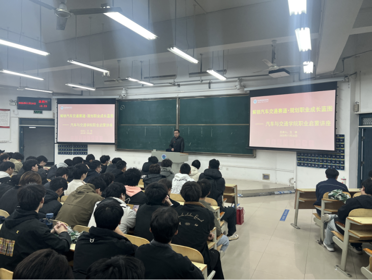 为帮助学生明确职业方向、搭建成长路径,11 月 26 日晚,汽车与交通学院于 1101 教室成功举办 “解锁汽车交通赛道・规划职业成长蓝图” 职业启蒙讲座。本次讲座特别邀请国家职业规划师、SIYB 省派讲师王林老师主讲,大二三百余名学生参与,现场干货满满,反响热烈。